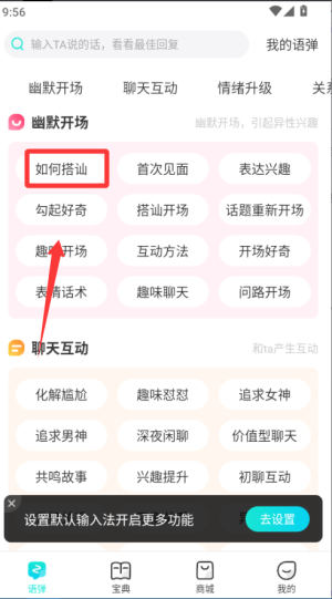 1、安装章鱼输入法后,在设置里切换输入法为章鱼模式,进入聊天界面时,遇到不知道回什么的情况,直接点击话术搜索框,输入关键词就能找到合适回复。