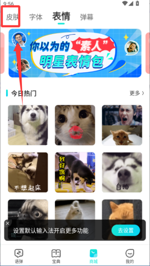 3、打开皮肤中心,选择喜欢的键盘主题风格,还能上传照片制作专属表情包,打字时输入文字会自动推荐匹配表情,让聊天更生动。