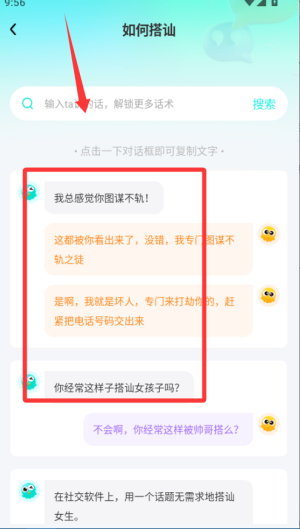 2、在推荐话术里浏览常见聊天场景,比如初次搭讪或日常问候,长按喜欢的句子就能复制,粘贴到聊天框发送,不用自己绞尽脑汁想内容。