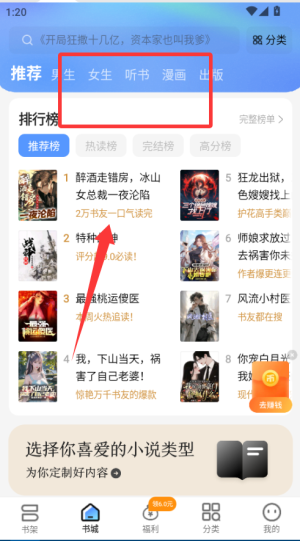 2、在首页浏览热门推荐或通过分类标签寻找小说,也可使用搜索框直接查找书名或作者。