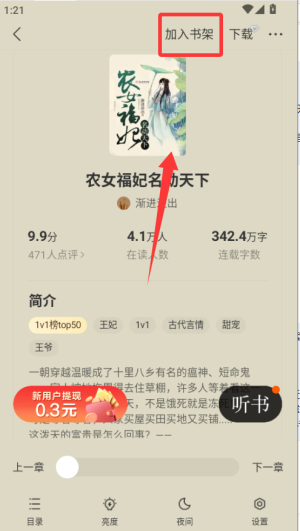 3、找到感兴趣的小说后,点击加入书架以便下次继续阅读,还能对书架进行自定义整理。