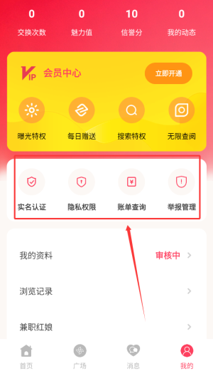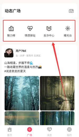 3、广场板块集中展示了用户魅力排行榜、情感话题交流区、防诈骗知识中心及不良行为曝光台等社区互动与安全模块。