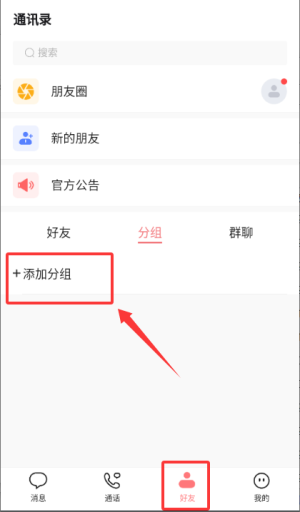 4、在好友页分组标签下,点击添加分组选项创建新分组。