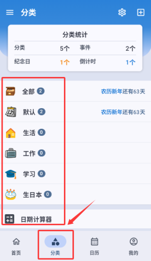 默认分类:默认包含了生日本、生活、工作和学习四个倒数本,可以自定义更多分类。