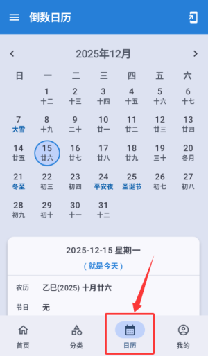 3、切换至日历选项,进入倒数日历页查看日期信息。
