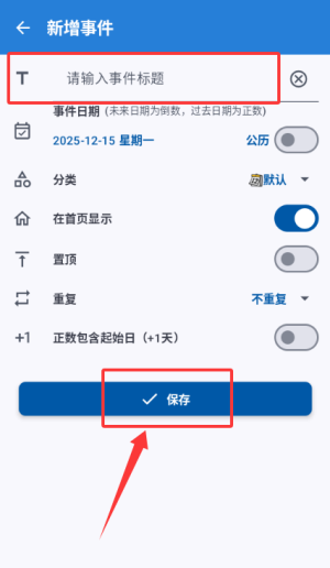 3、在新增事件页输入标题设置信息,点击保存添加记录。
