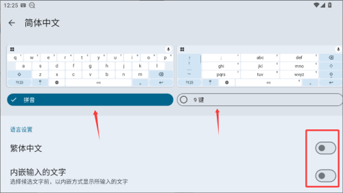 4、根据使用习惯选择拼音或九键输入法,并启用所需辅助功能。