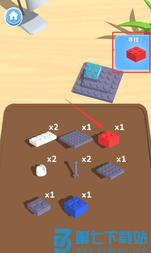 2、根据红框箭头提示,寻找并选中红色积木零件。