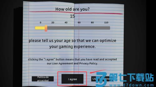 1、滑动年龄选择15岁,点击红框标注的I agree按钮确认。
