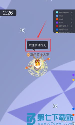 3、根据红框箭头按住移动捡刀,操控角色拾取武器。