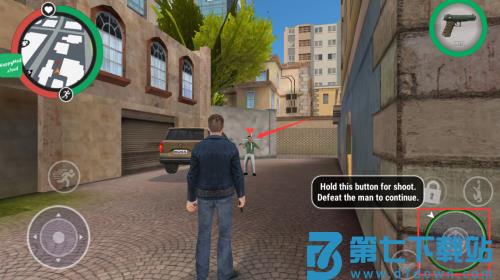 2、按住红框射击按钮,击败眼前的人继续任务。