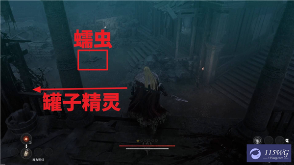 跳下平台后,直接向左看,你会看到一个可以破坏的罐子,打破后可以找到本区域的罐子精灵。同时,注意旁边红光尸体的位置,它是一个蠕虫诱饵。