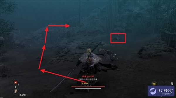 沿着左侧的小路走到尽头,你会发现一个道具。接着,走到右侧的梯子旁,爬到高处会遇到一只处于红温状态的熊。熊旁边的尸体上可以捡到【灵魂之泪粉末】。